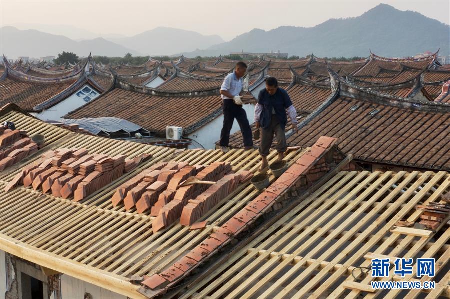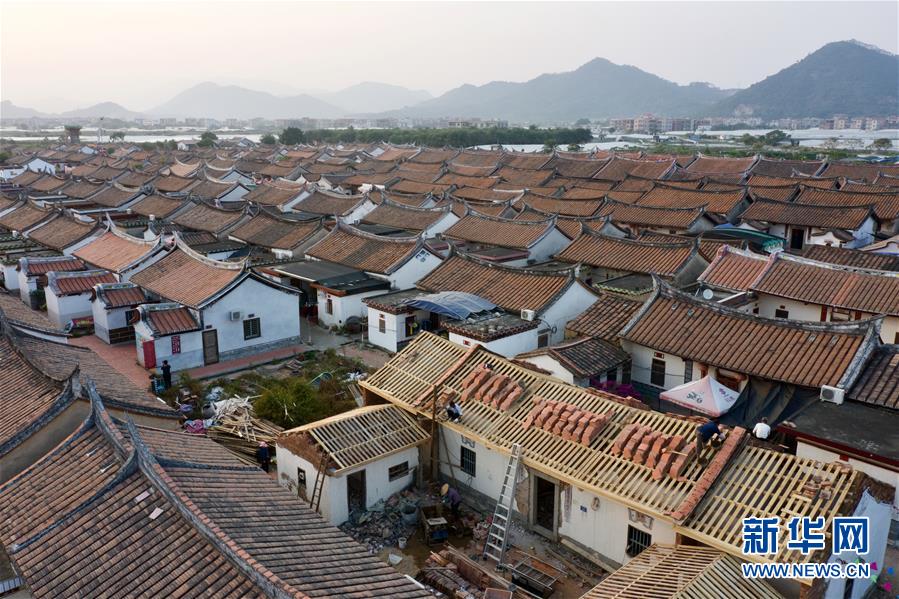 11月14日,埭美村村民在修缮一座古民居(无人机拍摄)。新华社记者姜克红摄