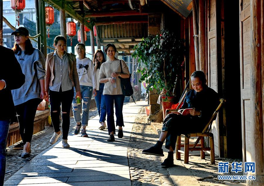 游客在武夷山下梅村游览(11月5日摄)。福建省武夷山市下梅村是“中国历史文化名村”,这里历史悠久,人文荟萃,至今保存着70余幢明清时代的古民居。人工运河穿村而过,古民居、凉亭、古街等构成了别具特色的江南水乡风景。新华社记者马平摄