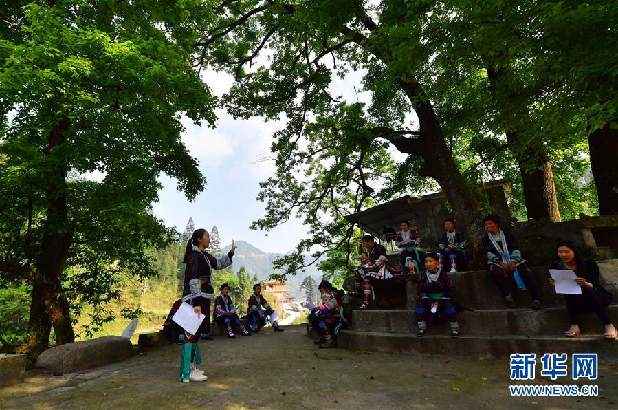 在党鸠村桂黔乌英苗寨大枫树下,梁孟香(左一)在培训公开课上讲课(4月16日摄)。新华社记者黄孝邦摄