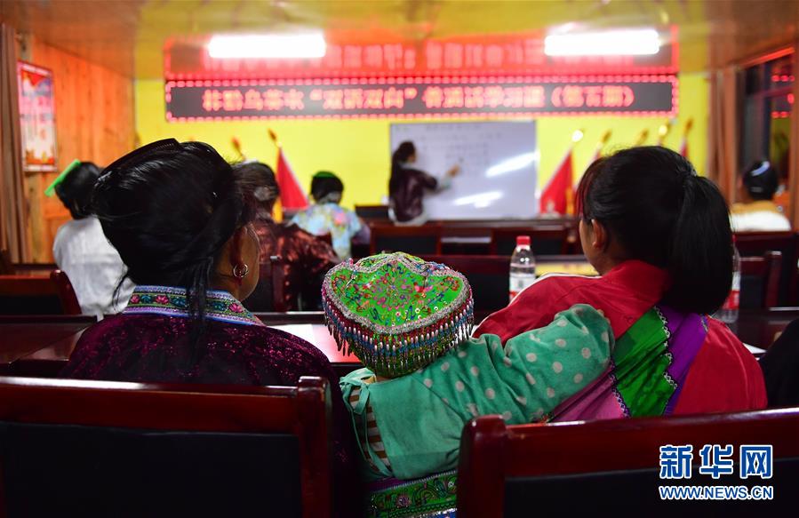在党鸠村桂黔乌英苗寨妇女普通话培训班上,妇女们在听梁孟香讲课(4月15日摄)。新华社记者黄孝邦摄