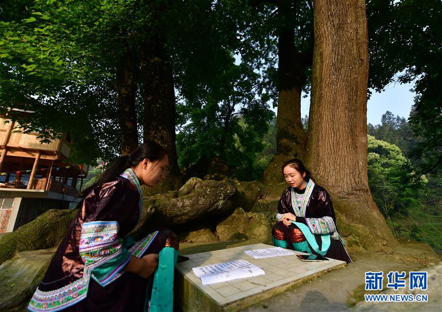 在党鸠村桂黔乌英苗寨,梁孟香(右)和小伙伴在公开课前备课(4月16日摄)。新华社记者黄孝邦摄