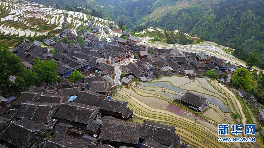 4月19日拍摄的贵州省从江县加榜乡加车村苗寨景观(无人机照片)。贵州省从江县把人居环境整治作为脱贫攻坚工作的一项重要举措来抓,对乡村规划范围内长期无人居住的危房、废弃禾仓、棚圈、柴草房和房前屋后的残垣断壁等进行清理整治,进行复垦复绿,同时开展农户卫生和村寨环境整治,做到乡村环境干净、卫生、整洁,扮靓美丽乡村。新华社记者杨文斌摄