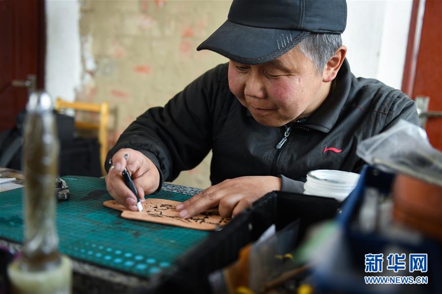内蒙古鄂温克族自治旗锡尼河镇村民米格木尔在制作皮雕(2020年4月15日摄)。新华社记者刘磊摄