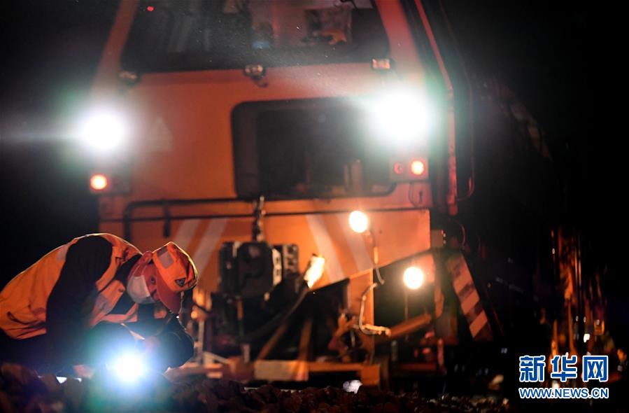4月20日,作业人员在捣固车前进行线路排查。新华社记者郝源摄