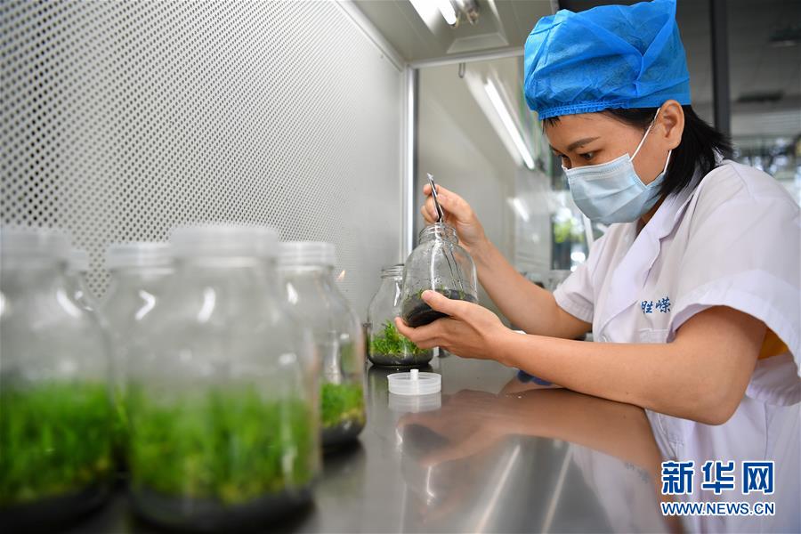 4月21日,在位于施茶村的海南胜嵘生物科技有限公司石斛育种培养室内,工作人员在进行石斛育种。新华社记者郭程摄