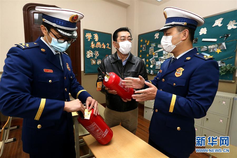 4月21日,消防员检查上海市第三女子中学的校内消防设施。4月27日,上海市高三年级、初三年级将返校开学。上海各中学从出入管理、环境消毒、物资配备、消防安全、应急预案等方面积极准备,运用消毒机器人、高科技测温仪等手段加强校园防疫,保障师生安全顺利返校。新华社记者陈飞摄