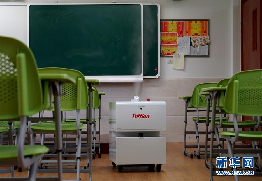 4月21日,消毒机器人在上海市闵行区颛桥中学的初三教室内消毒。4月27日,上海市高三年级、初三年级将返校开学。上海各中学从出入管理、环境消毒、物资配备、消防安全、应急预案等方面积极准备,运用消毒机器人、高科技测温仪等手段加强校园防疫,保障师生安全顺利返校。新华社记者刘颖摄