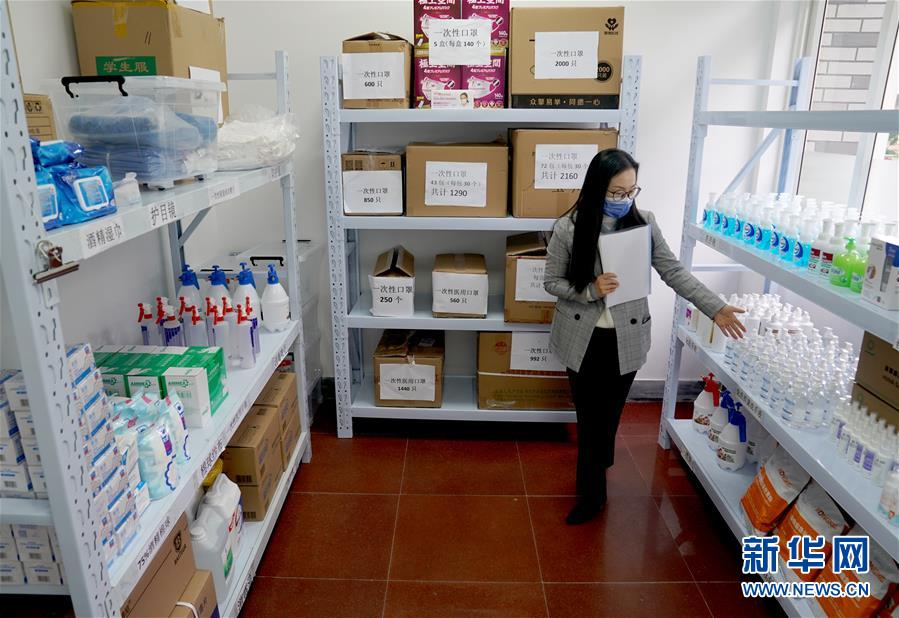 4月21日在上海市闵行区颛桥中学拍摄的防疫物资仓库。4月27日,上海市高三年级、初三年级将返校开学。上海各中学从出入管理、环境消毒、物资配备、消防安全、应急预案等方面积极准备,运用消毒机器人、高科技测温仪等手段加强校园防疫,保障师生安全顺利返校。新华社记者刘颖摄