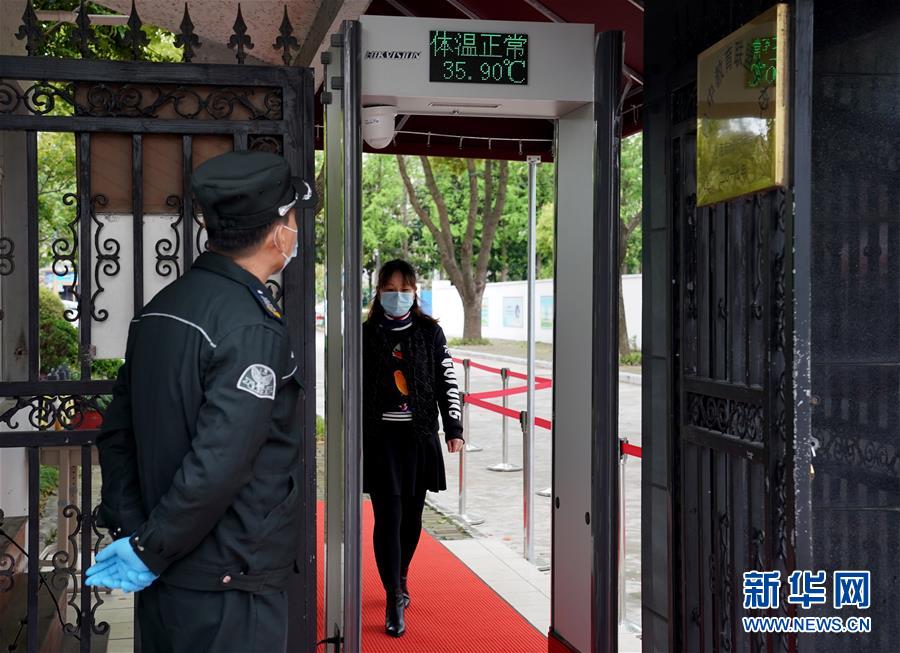 4月21日在上海市闵行区颛桥中学校门口拍摄的热像体温筛检仪。4月27日,上海市高三年级、初三年级将返校开学。上海各中学从出入管理、环境消毒、物资配备、消防安全、应急预案等方面积极准备,运用消毒机器人、高科技测温仪等手段加强校园防疫,保障师生安全顺利返校。新华社记者刘颖摄