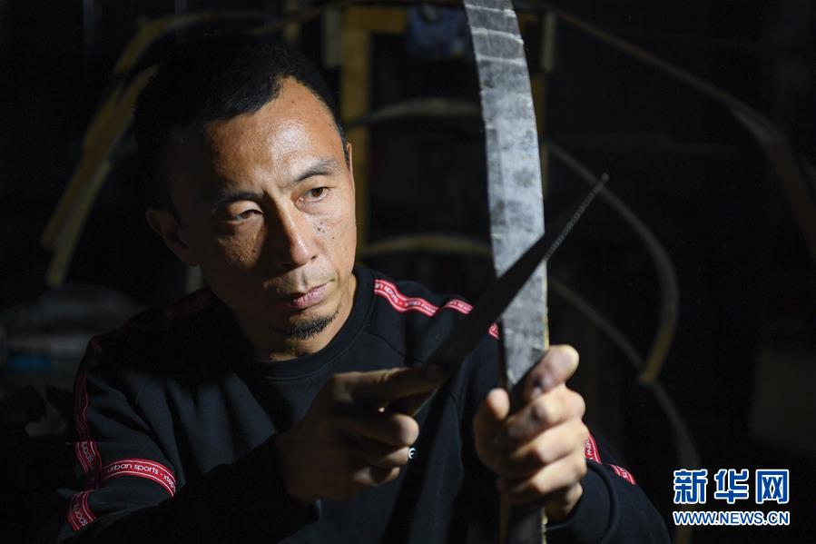 鄂建烨在打磨弓胎(2019年10月19日摄)。竹子、木料、牛角……位于沈阳市于洪区的一间平房里堆满各种制作传统弓箭的原料。这间房子的主人,今年45岁的鄂建烨是沈阳市非物质文化遗产代表性项目——锡伯族弓箭传统制作技艺的传承人。鄂建烨出身于制弓世家,15岁开始跟随爷爷学习制作锡伯族传统弓箭。制作一张好的锡伯族筋角弓起码需要一年以上时间,虽然工序繁多复杂,但鄂建烨依旧严格按照古法制作锡伯族传统筋角弓,因其制作的弓箭质量上乘而广受传统弓箭爱好者的好评。在制弓之余,鄂建烨还开办传统弓箭俱乐部并积极参加各种射箭比赛,力图将这项技艺传承下去。新华社记者龙雷摄
