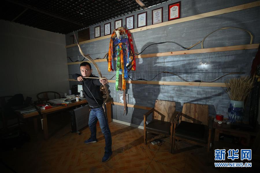 鄂建烨在测试一张弓的拉感(2019年10月28日摄)。竹子、木料、牛角……位于沈阳市于洪区的一间平房里堆满各种制作传统弓箭的原料。这间房子的主人,今年45岁的鄂建烨是沈阳市非物质文化遗产代表性项目——锡伯族弓箭传统制作技艺的传承人。鄂建烨出身于制弓世家,15岁开始跟随爷爷学习制作锡伯族传统弓箭。制作一张好的锡伯族筋角弓起码需要一年以上时间,虽然工序繁多复杂,但鄂建烨依旧严格按照古法制作锡伯族传统筋角弓,因其制作的弓箭质量上乘而广受传统弓箭爱好者的好评。在制弓之余,鄂建烨还开办传统弓箭俱乐部并积极参加各种射箭比赛,力图将这项技艺传承下去。新华社记者龙雷摄