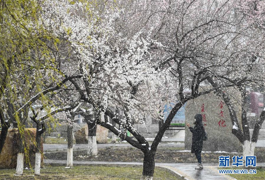 4月21日,在长春市杏花村公园,市民在雪中拍照留念。当日,吉林省多地迎来降雪天气。新华社记者许畅摄