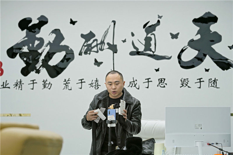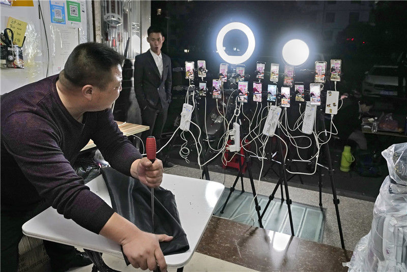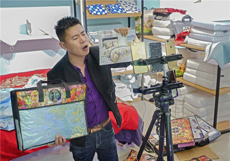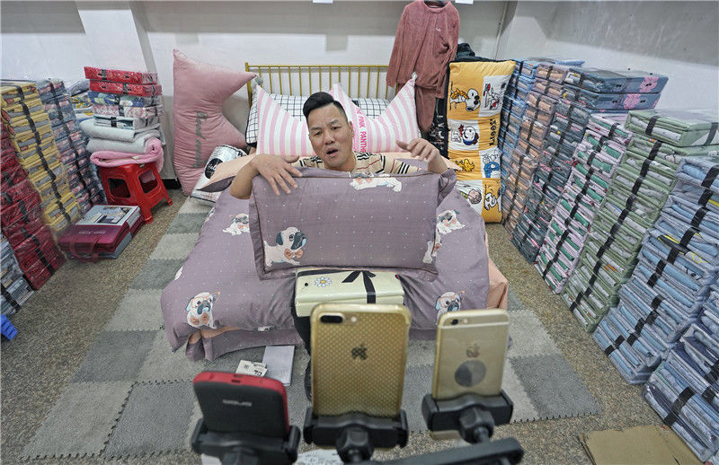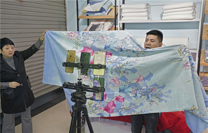 2019年11月11日,浙江金华,义乌北下朱村,在一家床上用品销售商店,一名男子正在直播。这个网名叫“点子大哥”的男子姓刘,49岁,来自杭州农村,有三年半的直播经历。