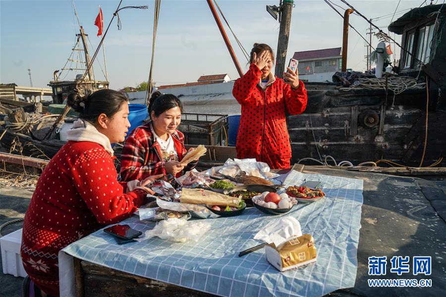 4月22日,马花雨(下右)、徐红红(上)、陆倩(下左)在渔船上拍摄推销海产品的短视频。近年来,江苏省连云港市赣榆区海头镇越来越多的居民开始直播销售海产品,当地渔船、码头和市场上活跃着一批网络直播好手。目前,全镇有3000多户商家从事海产品直播销售业务,形成了集捕捞、加工、包装、销售和物流于一体的电商产业链。新华社记者杨磊摄