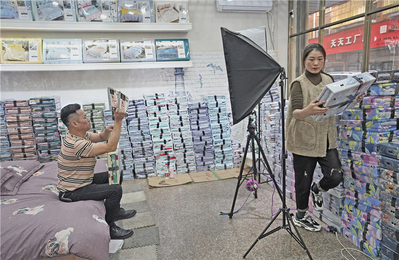 2019年11月10日,江金华,义乌北下朱村,在店铺里直播销售床上用品的两个店员。