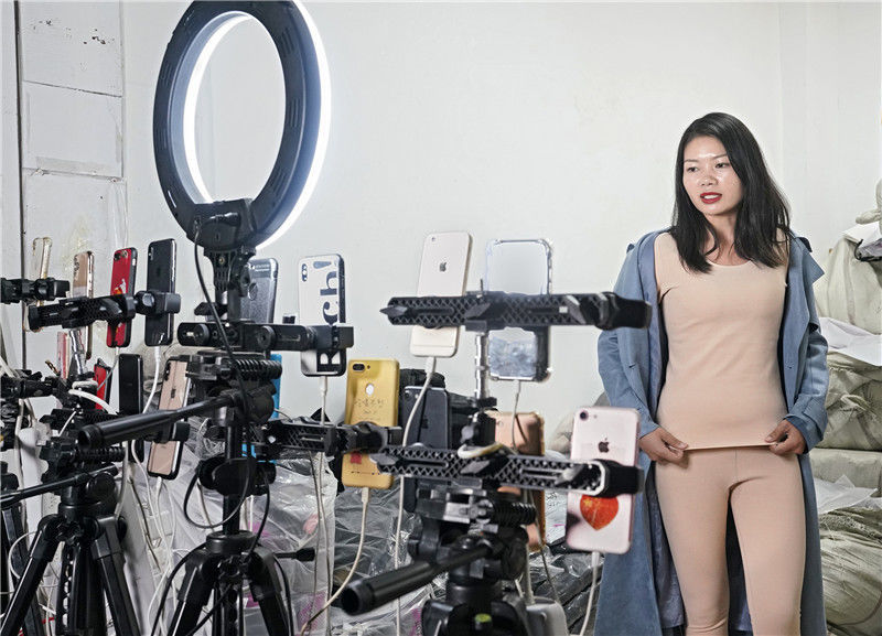 2019年11月9日,浙江金华,义乌北下朱村,女主播在直播销售保暖内衣。