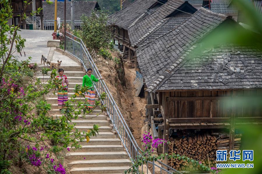 4月12日,在云南省勐海县布朗山乡曼囡村曼班三队,娜四(左)和妹妹走在村里。新华社记者胡超摄
