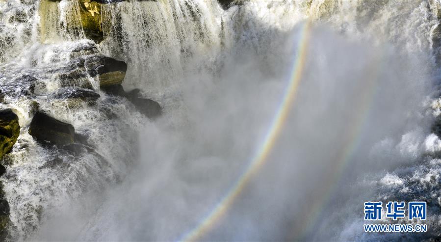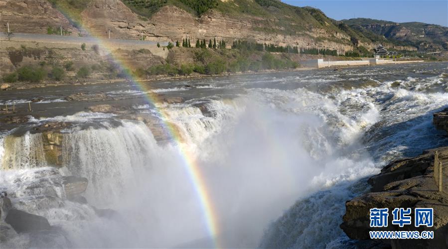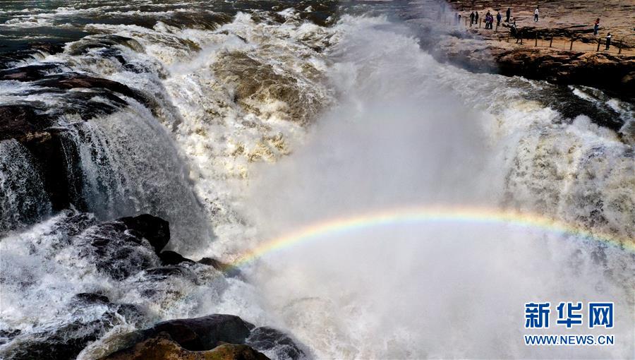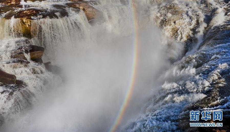 4月23日,黄河壶口瀑布出现彩虹(无人机照片)。新华社记者陶明摄