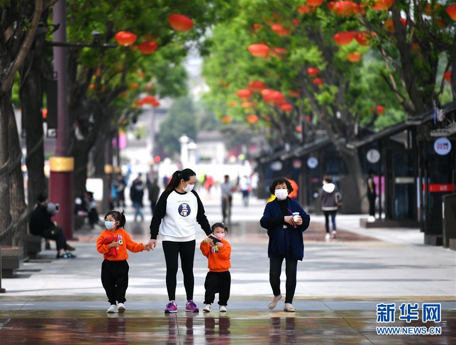 4月23日,游客在西安大唐不夜城步行街游览。 新华社记者 张博文 摄