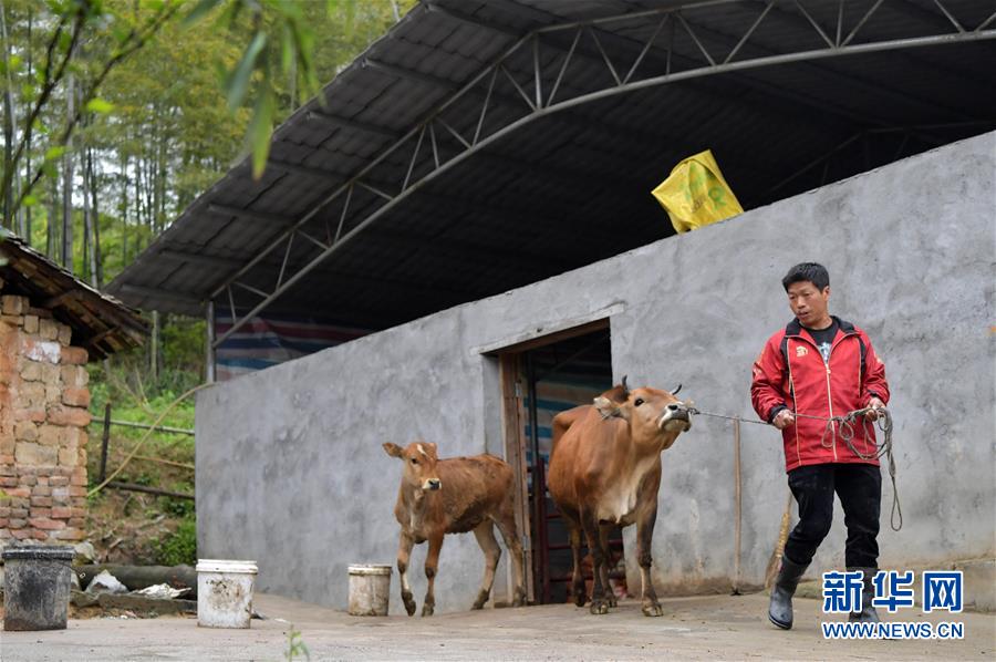 在江西省宜春市袁州区天台镇环溪村,郑富平牵着自己养的牛准备去村里“遛弯”(4月22日摄)。新华社记者 彭昭之 摄