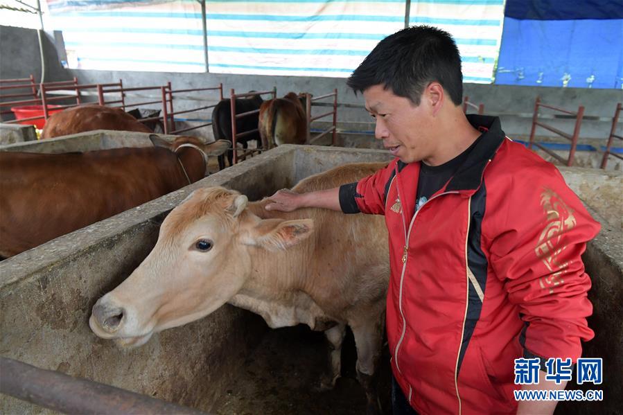 在江西省宜春市袁州区天台镇环溪村,郑富平通过触摸,了解牛的生长情况(4月22日摄)。新华社记者 彭昭之 摄