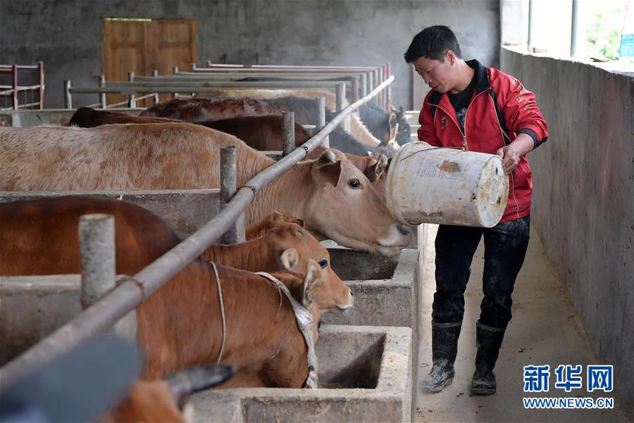 在江西省宜春市袁州区天台镇环溪村,郑富平在喂牛(4月22日摄)。新华社记者 彭昭之 摄
