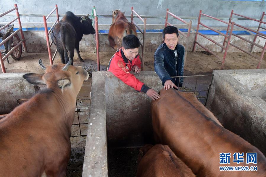 在江西省宜春市袁州区天台镇环溪村,同村的农户(右)在郑富平家的牛棚内了解牛的生长情况,和郑富平交流养殖心得(4月22日摄)。新华社记者 彭昭之 摄