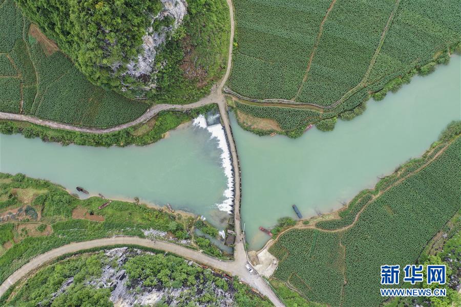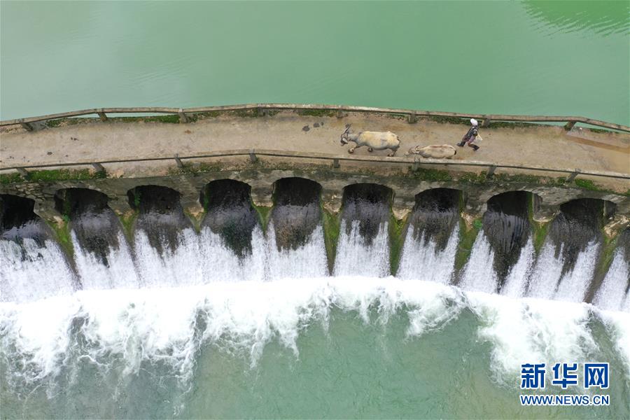 4月23日,在广西隆安县南圩镇,农人赶着牲畜走过一座小桥(无人机照片)。新华社记者周华摄