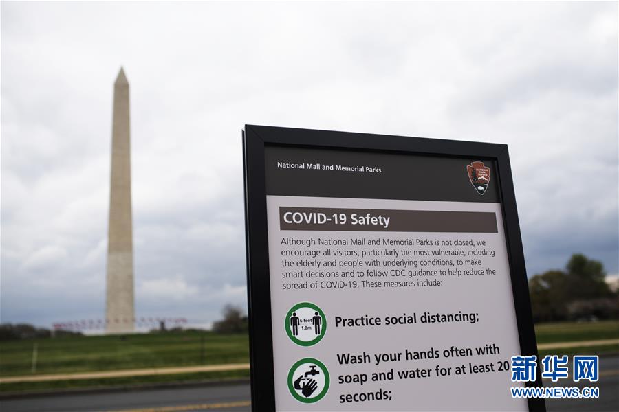 这是4月1日在美国华盛顿纪念碑附近拍摄的新冠肺炎疫情防控提示牌。新华社记者刘杰摄