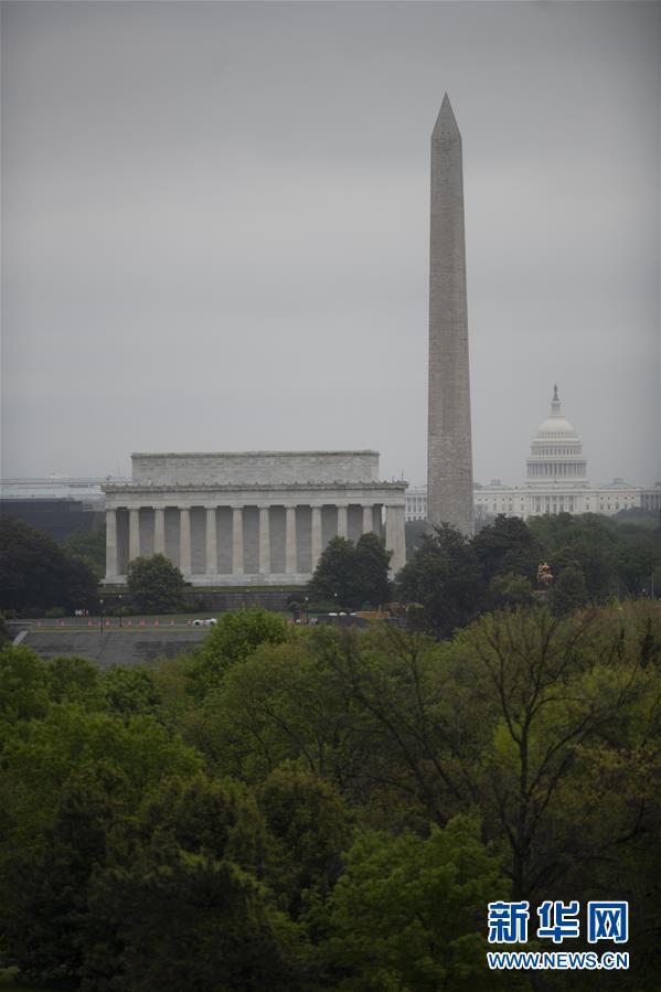 这是4月24日在美国弗吉尼亚州阿灵顿拍摄的国会大厦、华盛顿纪念碑和林肯纪念堂。新华社记者刘杰摄