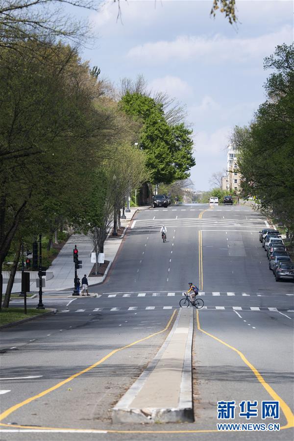 4月8日,在美国首都华盛顿,市民在空旷的街道上骑行。新华社记者刘杰摄