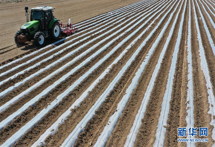4月25日,滦南县东黄坨镇新户村农民使用拖拉机给准备栽植烟薯秧苗的土地开沟覆膜(无人机照片)。近年来,河北省滦南县利用当地土壤和气候特点,引导农民因地制宜发展烟薯种植,取得良好效果。目前该县烟薯种植面积达3万多亩,每亩年收入达5000多元。新华社记者杨世尧摄