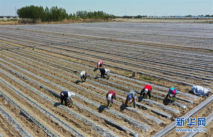 4月25日,滦南县东黄坨镇新户村农民在田间栽植烟薯秧苗(无人机照片)。近年来,河北省滦南县利用当地土壤和气候特点,引导农民因地制宜发展烟薯种植,取得良好效果。目前该县烟薯种植面积达3万多亩,每亩年收入达5000多元。新华社记者杨世尧摄