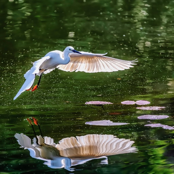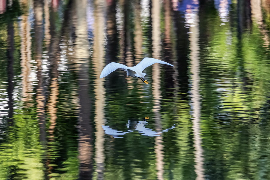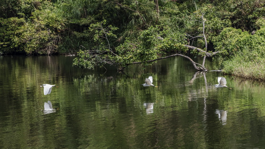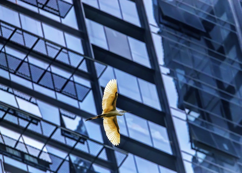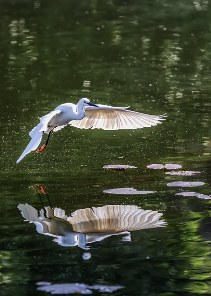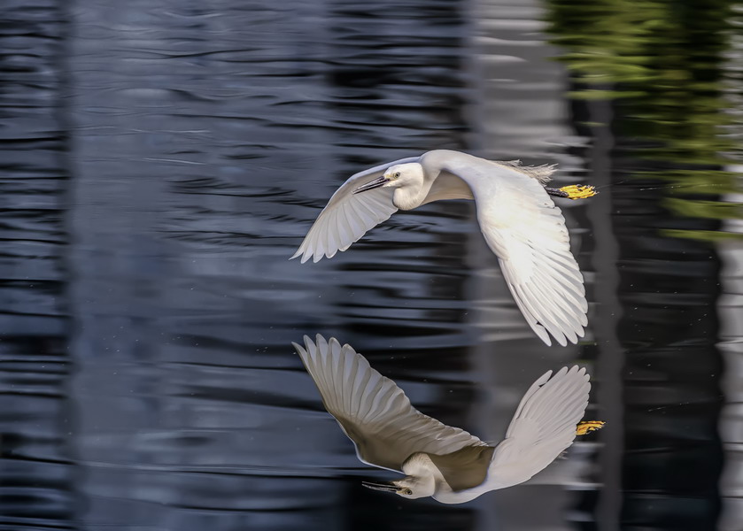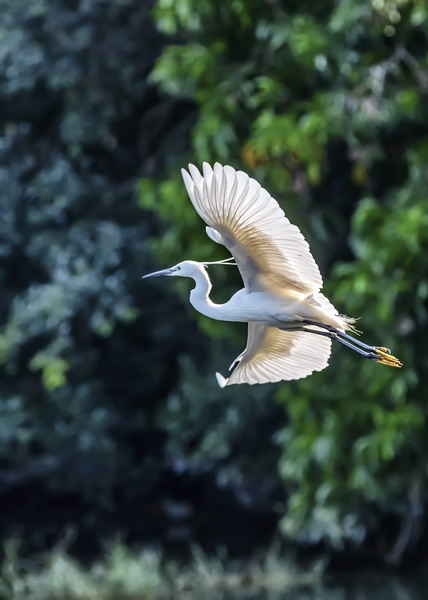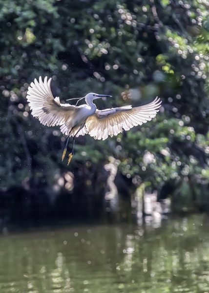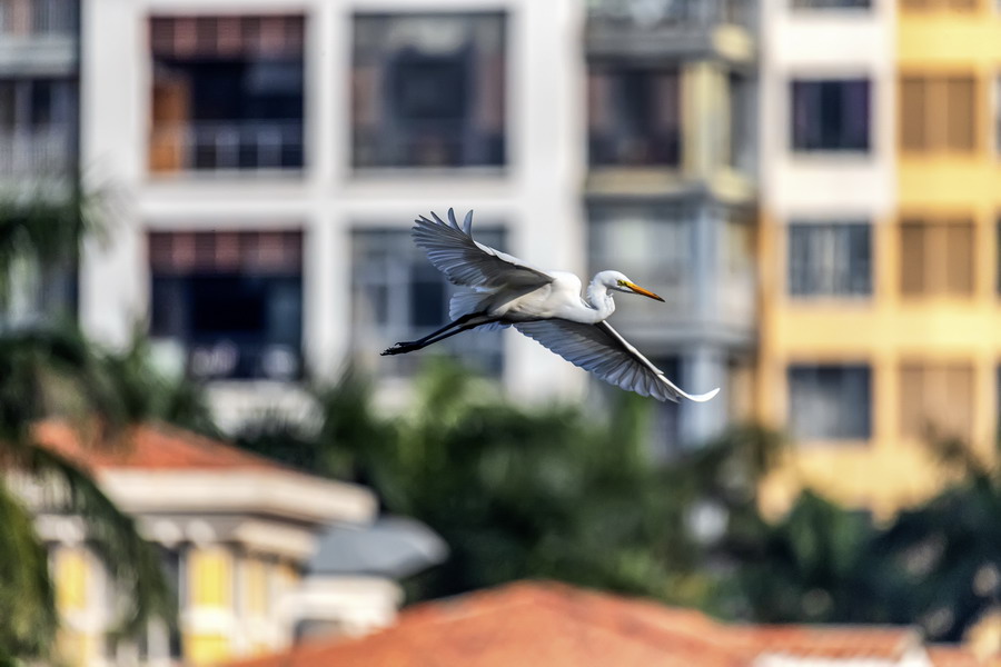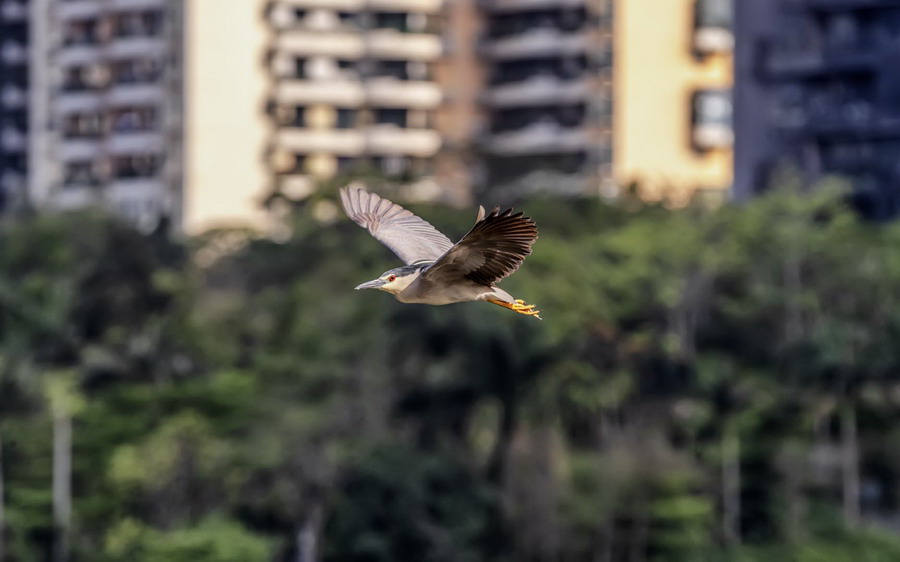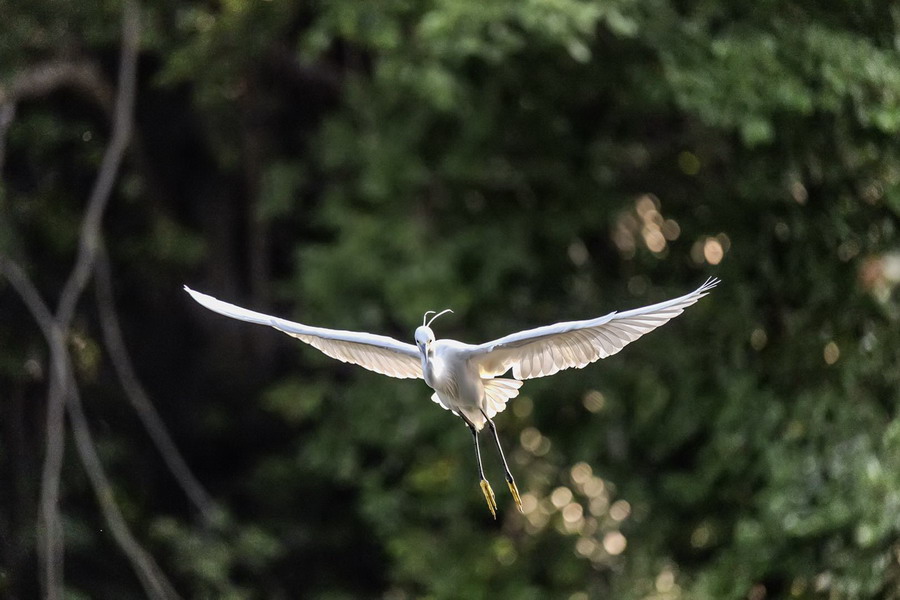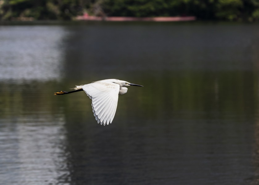 4月15日,摄于南山区华侨城天鹅堡附近。这是深圳拍鹭鸟的其中一个好去处。白鹭飞行时头往回缩至肩背处,颈向下曲成袋状,两脚向后伸直,远远突出于尾后,两翅缓慢地鼓动飞翔。徐捷摄