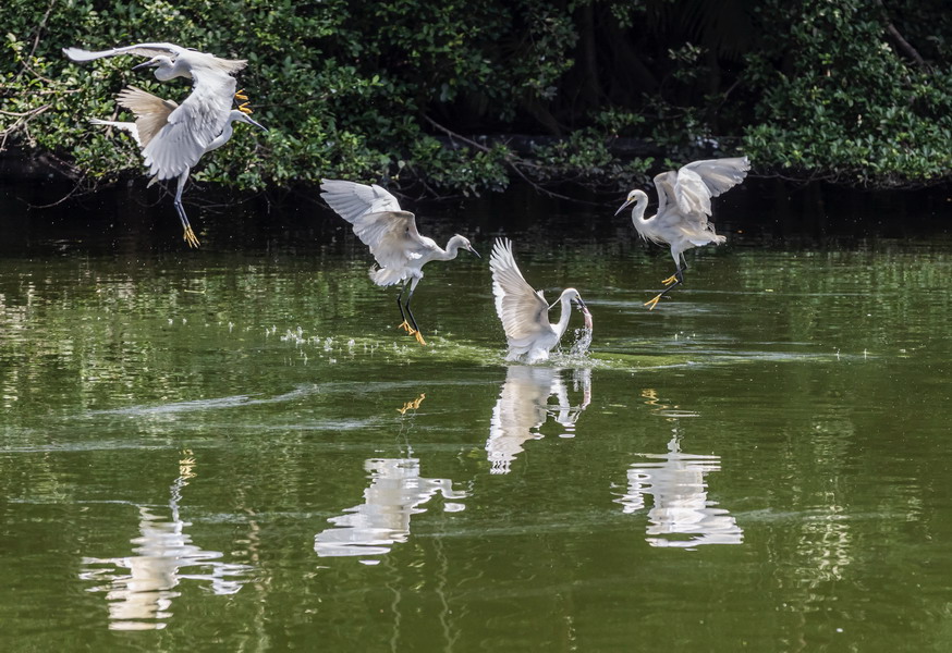 4月15日,摄于南山区华侨城天鹅堡附近。这是深圳拍鹭鸟的其中一个好去处。四只白鹭在水面上争相捕食。徐捷摄