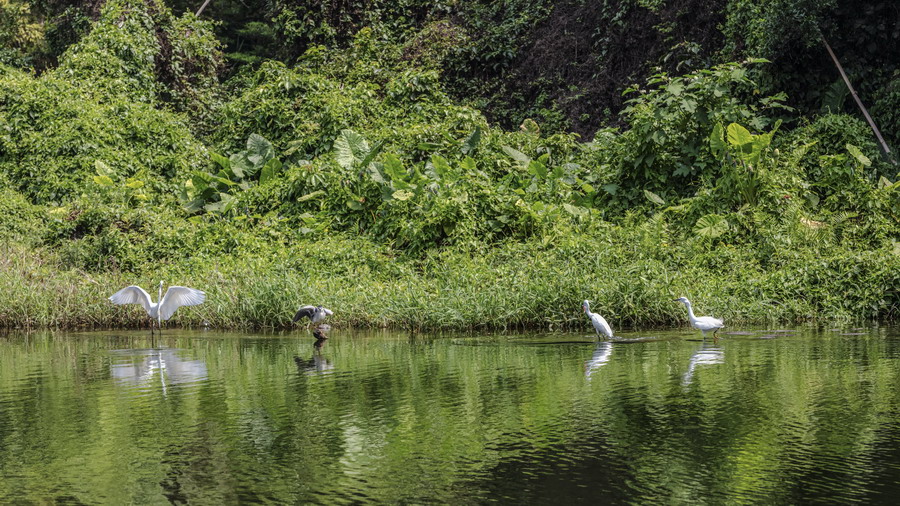 4月15日,摄于南山区华侨城天鹅堡附近。这是深圳拍鹭鸟的其中一个好去处。左一白鹭捕到食物,后方两只白鹭追赶。徐捷摄