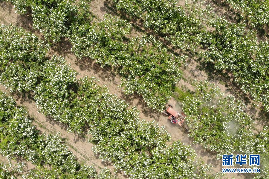 4月26日,农民驾驶农机在河北省清河县马屯红果种植专业合作社的山楂种植区内劳作(无人机照片)。4月下旬以来,河北省清河县2万余亩山楂树竞相开花,成为一道亮丽的风景线。清河县年产山楂7.5万余吨,山楂种植已成为当地农民的重要增收途径。新华社记者牟宇摄