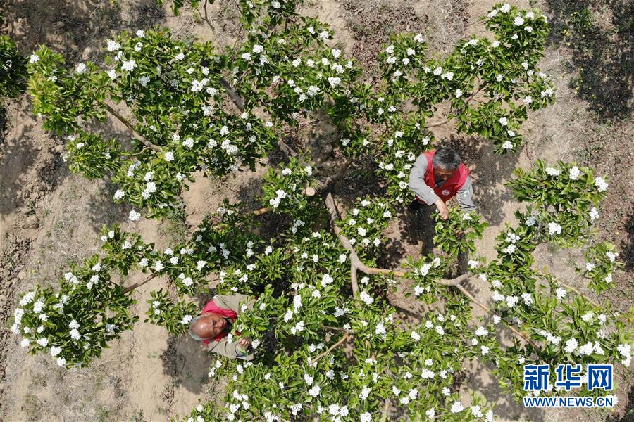 4月26日,农民在河北省清河县马屯红果种植专业合作社的山楂种植区内为果树疏花(无人机照片)。4月下旬以来,河北省清河县2万余亩山楂树竞相开花,成为一道亮丽的风景线。清河县年产山楂7.5万余吨,山楂种植已成为当地农民的重要增收途径。新华社记者牟宇摄