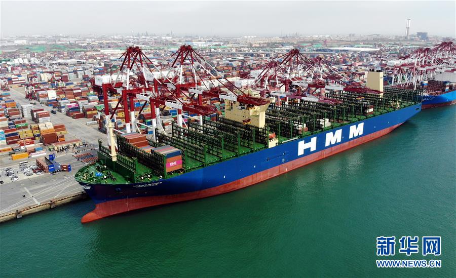 “现代商船阿尔赫西拉斯”轮靠泊在青岛港前湾码头(无人机照片,4月26日摄)。当日,载箱量可达2.4万标准箱的世界最大集装箱船“现代商船阿尔赫西拉斯”轮从山东青岛港开启首航,这条船的甲板面积超过2.4万平方米,相当于3.5个标准足球场大小。新华社记者李紫恒摄