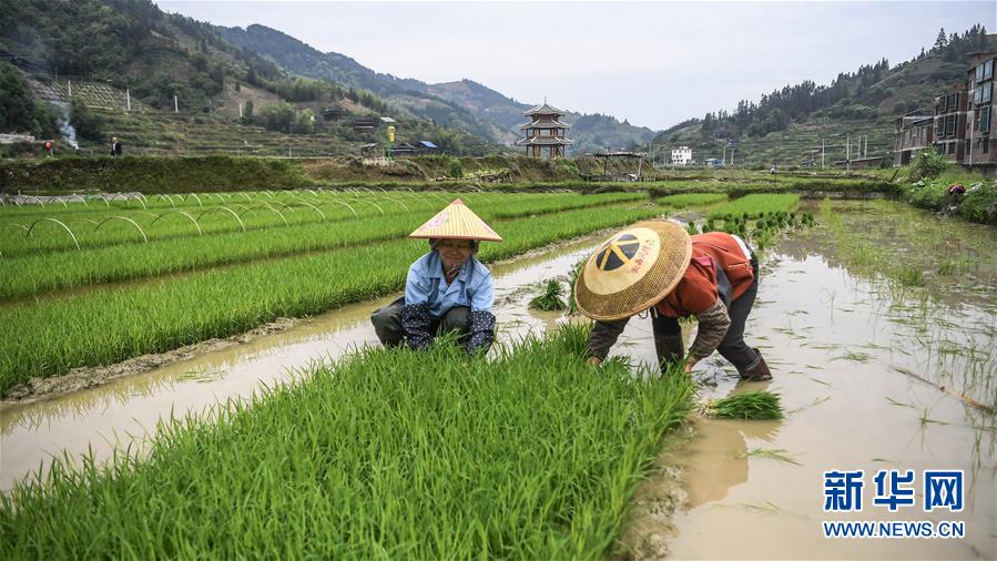广西三江侗族自治县八江镇平善村村民在田间拔秧苗(4月25日摄)。目前,广西柳州市三江侗族自治县群众抓住时令,抢种早稻,培育灵芝和果蔬等经济作物,全力发展生产,决战脱贫攻坚。三江侗族自治县地处滇黔桂石漠化片区,是国家扶贫开发工作重点县。新华社记者张爱林摄