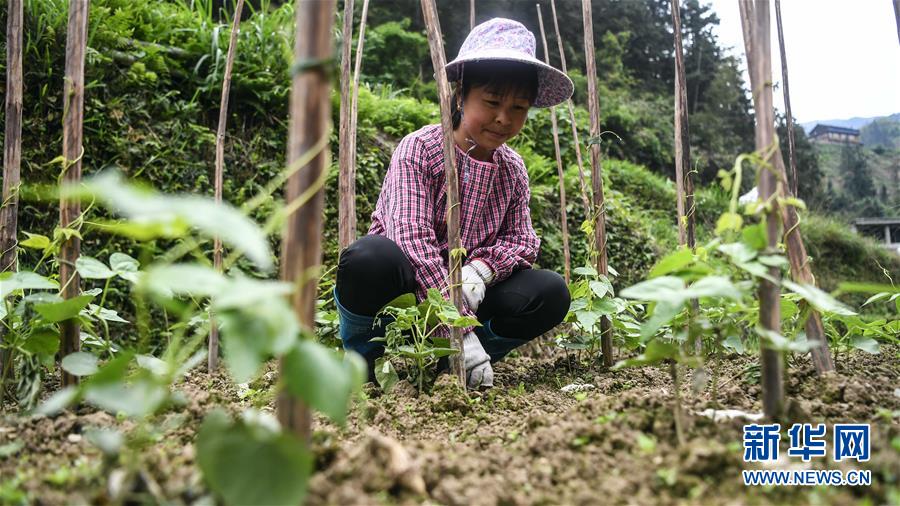 广西三江侗族自治县八江镇归内村村民在管护豆角种植园(4月25日摄)。目前,广西柳州市三江侗族自治县群众抓住时令,抢种早稻,培育灵芝和果蔬等经济作物,全力发展生产,决战脱贫攻坚。三江侗族自治县地处滇黔桂石漠化片区,是国家扶贫开发工作重点县。新华社记者张爱林摄