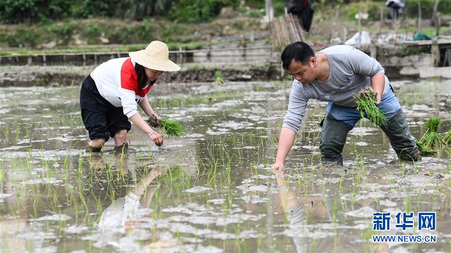 广西三江侗族自治县八江镇平善村村民栽种早稻(4月25日摄)。目前,广西柳州市三江侗族自治县群众抓住时令,抢种早稻,培育灵芝和果蔬等经济作物,全力发展生产,决战脱贫攻坚。三江侗族自治县地处滇黔桂石漠化片区,是国家扶贫开发工作重点县。新华社记者张爱林摄