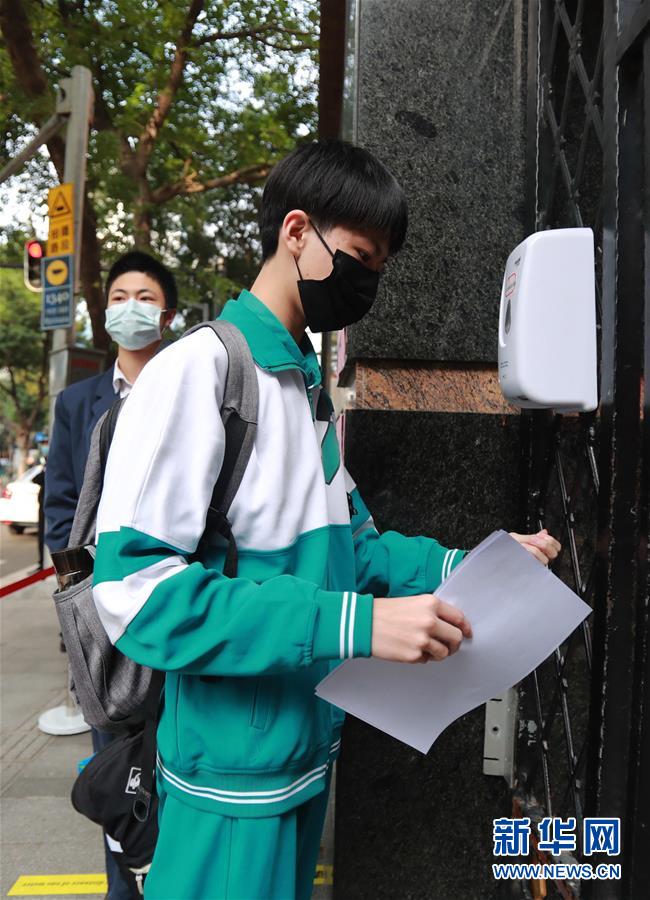 4月27日,广州市第二中学的学生在入校前清洁双手。当日,广州市初三高三年级返校。新华社记者卢烨摄