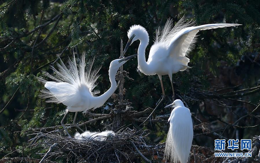 白鹭在象山森林公园嬉戏(4月26日摄)。近日,在江西省南昌市新建区象山森林公园内,已安家筑巢的大批鹭鸟正陆续孵化后代,一派生机勃勃的景象。新华社记者彭昭之摄
