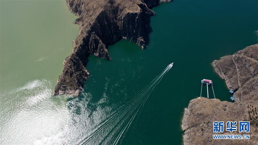 4月27日,一艘快艇从刘家峡水库库区的洮河与黄河交汇处驶过(无人机照片)。目前正值农田春灌用水高峰期,位于甘肃省永靖县的刘家峡水库按照黄河防总调度要求,再次调增出库流量,将日均出库流量加大到1260立方米每秒,支持黄河中下游地区农业春耕春灌生产。新华社记者陈斌摄