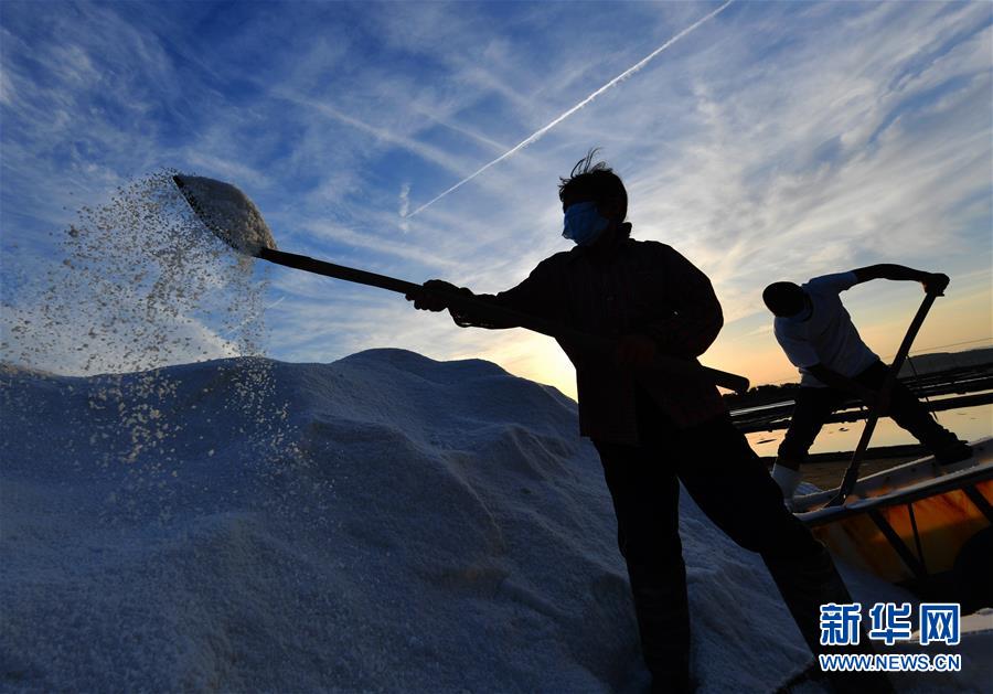 4月27日,莆田盐场的工人在劳作。莆田盐场位于福建省莆田市秀屿区东峤镇,辛勤劳作的盐工、纵横交错的晒盐池,共同构成如画的风景。新华社记者魏培全摄