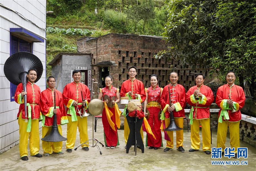 4月21日,永城吹打刘家乐班的班主、国家级非遗代表性传承人刘道荣(右一)带着所有成员在排练结束后合影。每逢过年过节,重庆綦江的国家级非物质文化遗产——永城吹打就会在镇街上演。永城吹打最初是流传于綦江永城镇一带的民间器乐,表演者有的演奏一米多长的大唢呐,有的负责敲鼓、打川钹,有的则吹奏低音唢呐。国家级非遗代表性传承人刘道荣年近八十,是演奏永城吹打的刘家乐班第十八代传人。他说,前些年农村人开始外出打工,乐班一度后继乏人。对此,綦江区通过政府购买文化服务等多种方式扶持永城吹打,并支持刘道荣于2011年成立永城吹打学校。刘道荣在外打工的女儿也回到家乡,成立永城吹打演艺公司。侄儿刘重辉更是在传统曲牌的基础上融入唱词,加入锣和川鼓。如今,綦江区拥有成规模的吹打乐班400多支,从业人员达到2000余人,成熟曲目近千首。新华社记者刘潺摄