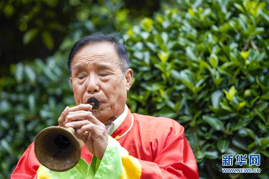 4月21日,永城吹打的国家级非遗代表性传承人刘道荣在进行排练。每逢过年过节,重庆綦江的国家级非物质文化遗产——永城吹打就会在镇街上演。永城吹打最初是流传于綦江永城镇一带的民间器乐,表演者有的演奏一米多长的大唢呐,有的负责敲鼓、打川钹,有的则吹奏低音唢呐。国家级非遗代表性传承人刘道荣年近八十,是演奏永城吹打的刘家乐班第十八代传人。他说,前些年农村人开始外出打工,乐班一度后继乏人。对此,綦江区通过政府购买文化服务等多种方式扶持永城吹打,并支持刘道荣于2011年成立永城吹打学校。刘道荣在外打工的女儿也回到家乡,成立永城吹打演艺公司。侄儿刘重辉更是在传统曲牌的基础上融入唱词,加入锣和川鼓。如今,綦江区拥有成规模的吹打乐班400多支,从业人员达到2000余人,成熟曲目近千首。新华社记者刘潺摄