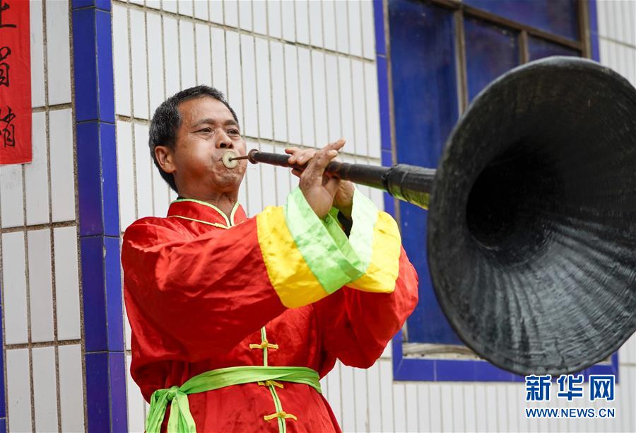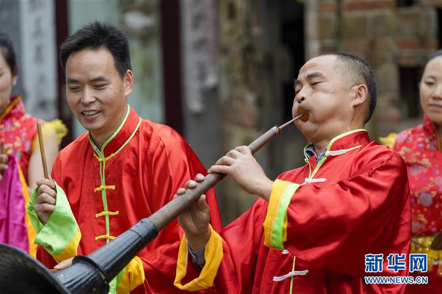4月21日,永城吹打刘家乐班成员用自制的特色唢呐进行演奏。每逢过年过节,重庆綦江的国家级非物质文化遗产——永城吹打就会在镇街上演。永城吹打最初是流传于綦江永城镇一带的民间器乐,表演者有的演奏一米多长的大唢呐,有的负责敲鼓、打川钹,有的则吹奏低音唢呐。国家级非遗代表性传承人刘道荣年近八十,是演奏永城吹打的刘家乐班第十八代传人。他说,前些年农村人开始外出打工,乐班一度后继乏人。对此,綦江区通过政府购买文化服务等多种方式扶持永城吹打,并支持刘道荣于2011年成立永城吹打学校。刘道荣在外打工的女儿也回到家乡,成立永城吹打演艺公司。侄儿刘重辉更是在传统曲牌的基础上融入唱词,加入锣和川鼓。如今,綦江区拥有成规模的吹打乐班400多支,从业人员达到2000余人,成熟曲目近千首。新华社记者刘潺摄