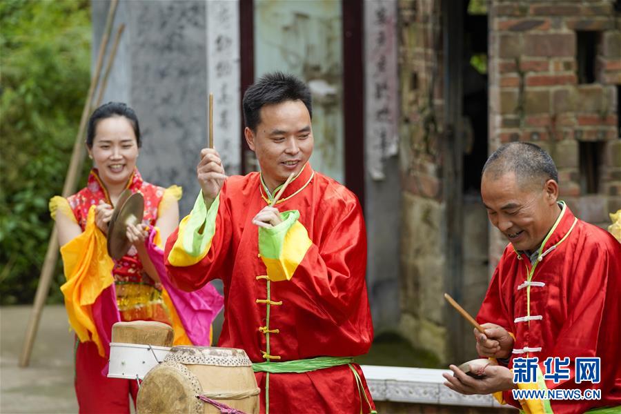 4月21日,永城吹打刘家乐班成员刘重辉(中)和罗家平(右)在进行排练。每逢过年过节,重庆綦江的国家级非物质文化遗产——永城吹打就会在镇街上演。永城吹打最初是流传于綦江永城镇一带的民间器乐,表演者有的演奏一米多长的大唢呐,有的负责敲鼓、打川钹,有的则吹奏低音唢呐。国家级非遗代表性传承人刘道荣年近八十,是演奏永城吹打的刘家乐班第十八代传人。他说,前些年农村人开始外出打工,乐班一度后继乏人。对此,綦江区通过政府购买文化服务等多种方式扶持永城吹打,并支持刘道荣于2011年成立永城吹打学校。刘道荣在外打工的女儿也回到家乡,成立永城吹打演艺公司。侄儿刘重辉更是在传统曲牌的基础上融入唱词,加入锣和川鼓。如今,綦江区拥有成规模的吹打乐班400多支,从业人员达到2000余人,成熟曲目近千首。新华社记者刘潺摄